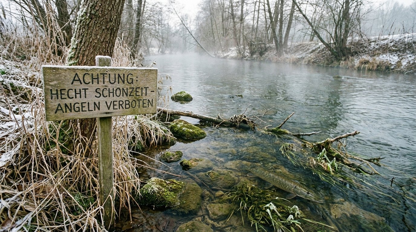 In Bundesländern ohne erweiterte Winter-Schonzeit (also überall außer Brandenburg, Mecklenburg-Vorpommern und Berlin) darf bis zum Schonzeitbeginn am 15. Februar auf Hecht geangelt werden. Die Wintermonate Dezember und Januar bieten Chancen auf kapitale Fische — die Hechte sind träge, fressen seltener, aber wenn sie zubeißen, sind es häufig die großen Exemplare.